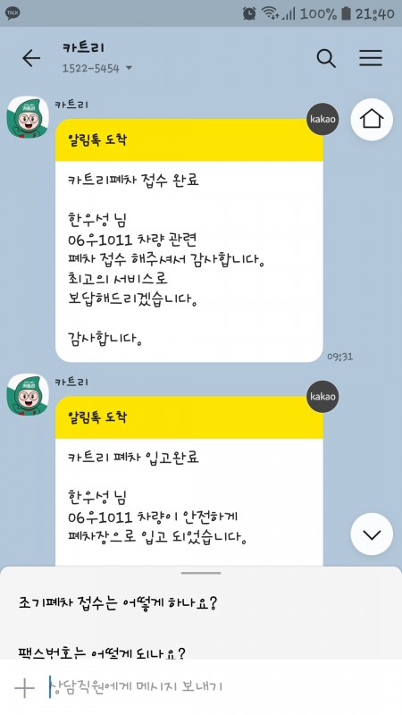 °ú°Å ¿©·¯¹ø Ÿ´ø Â÷·®À» ÆóÂ÷ º¸³½ ÀûÀÌ ÀÖ¾ú´Âµ¥, ÆóÂ÷ °úÁ¤À̳ª °¡°Ý Ãø¸é¿¡¼ ÇѰᰰÀÌ ¾Æ½¬¿òÀ̳ª ¼·¼·ÇÔÀÌ ±â¾ï¿¡ ³²¾Æ ÀÖ¾ú½À´Ï´Ù. ±×·¡¼ À̹ø¿¡ īƮ¸®¶ó´Â ¾ÛÀ» óÀ½ Á¢Çϸ鼵µ ¹Ý½Å¹ÝÀÇ ÇÏ´Â ¸¶À½ÀÌ ÄÇ´ø°Ô »ç½Ç ÀÔ´Ï´Ù. ÇÏÁö¸¸ ÆóÂ÷ ÈÄ ±×·± ÀúÀÇ ¾ÈÁÁÀº ±â¾ïµé°ú °ÆÁ¤Àº ½Ï »ç¶óÁ³½À´Ï´Ù~^^ ÆóÂ÷ Á¢¼öºÎÅÍ ¸»¼Ò ±×¸®°í Â÷·®°¡¾× ÀԱݱîÁö ³Ê¹« ¿Ïº®Çؼ ³î¶ú½À´Ï´Ù! ´ýÀ¸·Î °í°´¼¾ÅÍ »ó´ã¿øºÐµµ ¸Å¿ì ²Ä²ÄÇÏ°Ô ¼³¸í°ú Ä£ÀýÇÑ ´äº¯À» ÇØ Áּż ´õ¿í ¸¸Á·ÇÕ´Ï´Ù~^^ ¾ÕÀ¸·Î ±âȸ°¡ µÈ´Ù¸é ´Ù½Ã ÀÌ¿ëÇϰíÇ ¾Û ÀÔ´Ï´Ù!! °Ãß!!